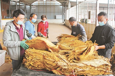 合作社烤烟专业采烤队取出烤房烟叶
