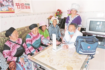 近年来,我州持续加强乡村医生队伍建设。目前,全州先后建起了1218个村卫生室,配备了3344名乡村医生,乡村公共卫生和基本医疗服务得到极大改善。图为蒙自市芷村镇查尼皮村的乡村医生杨伟到村民家中为村民检查身体。