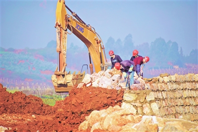 在里方河的3个施工现场,笔者看到施工车辆来来往往,挖掘机、装载机的轰鸣声此起彼伏,车来人往,一派繁忙;河道两侧,抽芽的葡萄藤上喷绿吐翠,一幅丰收在望的春天景致。在保证施工安全和施工质量的同时,施工方多措并举加快施工进度。