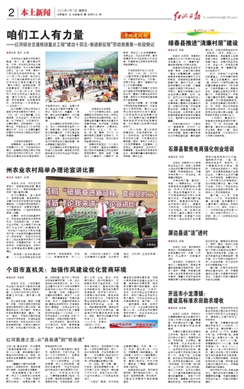 红河综合交通枢纽项目是云南省“四个一百”重点建设项目。为进一步加快红河综合交通枢纽项目建设,充分发挥参建单位职工“主人翁”作用,调动广大职工的主动性和积极性,自2021年10月9日起,由州总工会、州交通运输局联合主办的红河综合交通枢纽重点工程“建功十四五·奋进新征程”劳动竞赛启动。该竞赛分为两个阶段,2022年3月29日,历时两个月的红河综合交通枢纽工程“建功十四五·奋进新征程”劳动竞赛第一阶段圆满完成,共选树出3个先进班组、40名先进个人。