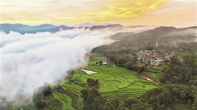 初秋八月,佳禾吐翠。在元阳哈尼梯田,渐熟的稻子由青变黄,万亩梯田恰似镶嵌在大山里的翡翠。图为晨曦中的哈尼梯田。