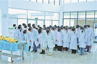 接收遗体当天,红河卫生职业学院在基础医学院举行了告别仪式。院领导、教师和学生们手持菊花,低头肃立,向生命定格在14岁的孟江成深深鞠躬、默哀。“一个家庭捐献两具遗体用作医学教学,非常少见。我十分敬佩这对父母能做出这样的决定。”基础医学院院长杨兴文向记者表示,遗体捐献对人体解剖学和社会医疗卫生事业具有极大的意义,是医学生探索人体解剖知识的“无言良师”。学院将牢记孟小所一家对医学事业的奉献,心怀感恩、敬佑生命,培养更多优秀的医护人员,为更多的患者和家庭解决痛苦、带去希望。