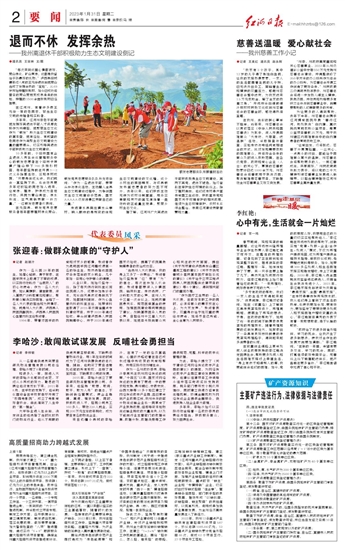 据了解,红河州广大离退休干部积极投身生态文明建设,离岗不离党,退休不褪色,始终奋战在保护生态环境的战线上。除了植树造林,他们还走村串户宣传爱国卫生运动,积极宣传党和国家关于环境保护的相关政策,继续为生态环境保护、农村水系综合整治、绿美红河建设贡献智慧和力量。