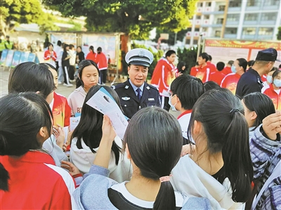 开展法律进学校活动,提升青少年法律意识。全州公安机关充分发挥法治副校长作用,组织开展“开学第一课 ”“法治进校园”,有效引导学生树立法治观念和法律意识,进一步提升青少年自我保护意识和能力。开远市公安局碑格派出所组织民警深入辖区中小学、幼儿园开展法治教育课,民警通过讲座的方式,根据年龄和心理特征、学校的具体情况进行法治授课;弥勒市公安局组织民警深入辖区各中小学开展法治宣讲进校园活动,通过摆放展板、发放宣传单、禁毒知识互动问答等形式,将法治知识传递给学生;河口县公安局走进辖区校园开展宣讲,民警利用PPT向学校师生现场讲解禁毒知识,通过分发法律手册及礼品等方式,增强学生们的参与感。