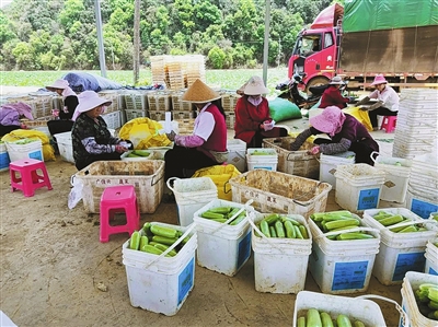本报讯 时下,在蒙自市雨过铺街道小寨村的葡萄种植园里,一串串晶莹剔透、碧绿的葡萄挂满枝头,散发着诱人的香甜气息。种植户胡石军正带领工人们争分夺秒地拆袋、采摘、分拣和装车,准备运往北京、上海、广州等地销售。