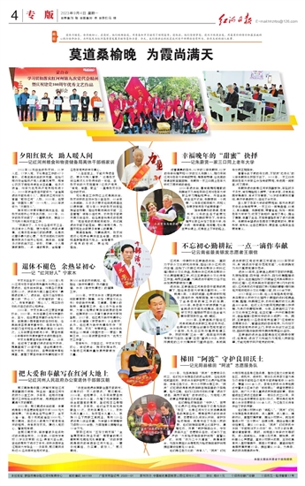 退休不褪色,余热映初心。在岗时,他们砥砺奋进,用青春和岁月谱写了辉煌篇章;退休后,他们坚持梦想,退而不休再出发,用最质朴的情怀和最真诚的心践行使命担当,力所能及为红河高质量发展贡献智慧和力量。今天,我们要讲述的就是我州老干部那些老有所为、余热生辉的动人故事。