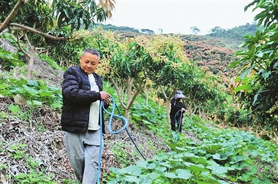 本报讯 时下,走进河口县老范寨乡村民杨开华家的芒果园,不仅芒果树长得郁郁葱葱,连同套种的蜜本南瓜也生机勃勃。杨开华和妻子正在为南瓜浇水、施肥,夫妻俩忙碌的身影在田间穿梭。
