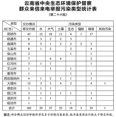 6月4日,中央第七生态环境保护督察组向云南移交第二十六批群众信访举报件105件,其中来电举报52件,来信举报53件。从信访举报件生态环境问题污染类型来看,涉及水29件、大气37件、土壤25件、生态19件、辐射3件、噪音35件、其他污染1件。从区域分布上看,昆明市43件、昭通市8件、曲靖市9件、玉溪市8件、保山市2件、楚雄州7件、红河州3件、文山州1件、普洱市1件、西双版纳州4件、大理州12件、德宏州1件、丽江市3件、迪庆州2件、临沧市1件。截至当日,云南省已累计收到中央第七生态环境保护督察组交办的信访举报件2485件,所有举报件均已及时转交相关州(市)处理。