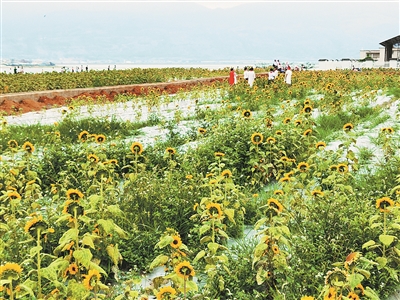 近日,在蒙自市雨过铺街道仁厚村委会柒零村新铺道路左侧,金灿灿的向日葵连成一片,与美丽的长桥海交相辉映,吸引无数游客前来拍照游玩。柒零村一跃成为蒙自市新晋的“网红”打卡地。