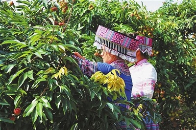 村民陶海燕正忙碌地采摘着成熟的荔枝。她手持剪刀,熟练地在枝头间穿梭,一颗颗饱满的荔枝被她轻轻剪下,放入背篓中。陶海燕的脸上洋溢着丰收的喜悦,她说:“今年雨水少,所以荔枝的甜度特别高。前几天,有个老板来尝过之后,就把我家的荔枝全订了,价格也比往年好。”