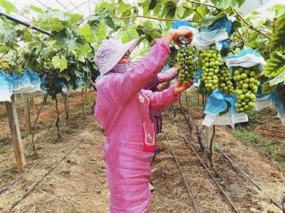 蒙自市雨过铺街道将葡萄种植作为增加群众收入和提高农业效益的关键产业来发展,今年,该街道葡萄种植挂果面积达3200亩,预计产值将突破1.2亿元。图为村民采摘葡萄。