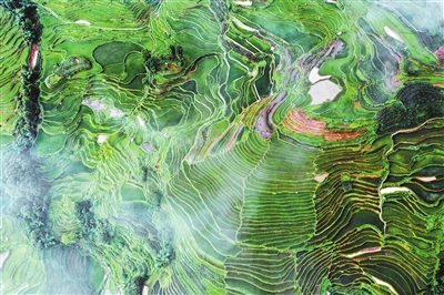 夏日,元阳县层层叠叠的梯田披上了翠绿的盛装,宛如大地上的绿宝石。图为从空中俯瞰,哈尼梯田美如仙境。通讯员 张朝福 摄影报道