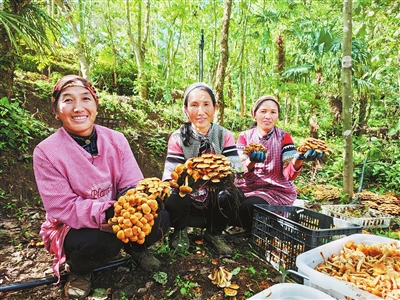 近日,红河县阿扎河乡俄比东村林下食用菌培育基地试种的5.2万棒滑子菇迎来丰收。该村通过“公司+农户”模式,实现了绿色发展和高效农业的有机结合,首茬滑子菇实现约2万元的经济收益,预计总收益将达8万元左右。图为农户采收滑子菇。