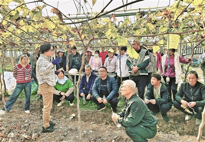入冬以来,趁着葡萄处于“休眠期”,弥勒市组织科技工作者深入田间地头,针对农户在葡萄种植过程中遇到的幼树整形、老树更新、弱树复壮、病虫害防治等问题进行讲解,提高农户种植技术,提升经济效益。图为科技工作者在田间地头与农户互动并讲解在葡萄种植中遇到的技术难题。