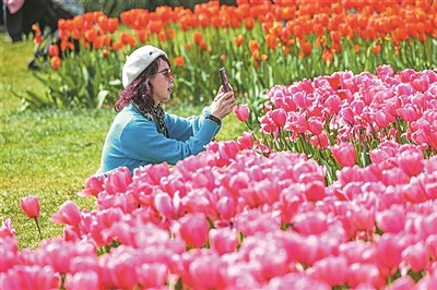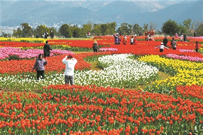 连日来,弥勒市太平湖森林公园的郁金香竞相绽放,呈现出一幅美丽的春日画卷,吸引众多游客前往观赏。图为游客在太平湖森林公园赏花游玩。