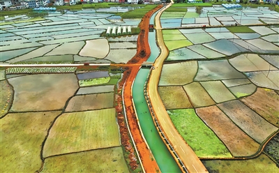 经过数年精心改造,弥泸灌区的竹朋新沟焕然一新。如今,这条沟渠功能完备,自通水以来,为弥勒市竹园镇、朋普镇沿线的5万亩农田提供灌溉,使农作物及时得到充足水分的滋养。图为竹朋新沟春灌农田全景。