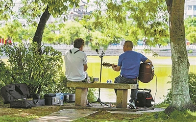 游人在湖边吟唱