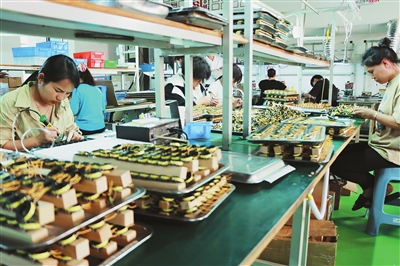 近年来,建水县着力打造“家门口”就业“30分钟生态圈”,群众无需到北上广深电子厂找工作,在“家门口”的车间就能就业。图为建水县金亿志电子元件(云南)有限公司内,工人在制作电子元件。