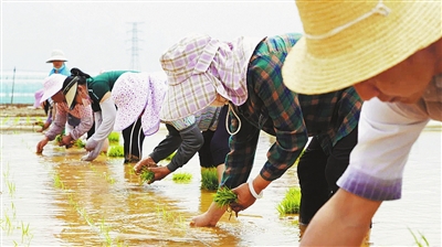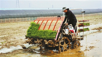 在草坝镇富民村四组袁隆平超级杂交水稻蒙自示范基地,村民正忙着超级杂交水稻的移栽。他们娴熟而默契地将秧盘送入试验田,有序进行定距、分秧、插秧等工作。另一边,伴随着机器的轰鸣声,一株株秧苗被移栽到大田。