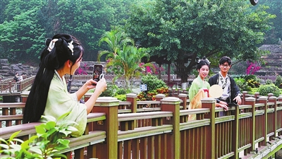 走进河口口岸森林公园,外籍游客黄秋娴和同伴穿上汉服在公园里打卡。“第一次穿上汉服,感受中国传统文化之美,特别开心。”黄秋娴说。