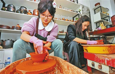 在建水古城的紫陶店里,游客可体验国家级非物质文化遗产建水紫陶的拉坯制作过程,可在匠人指导下沉浸式体验轮盘旋转间一团泥变成各种器具的细腻感受。