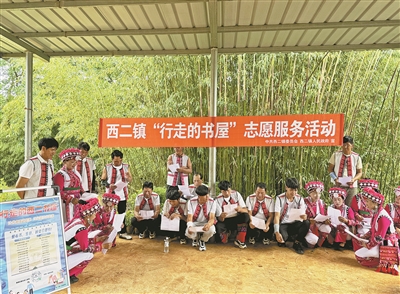 近年来,弥勒市西二镇着力打造“行走的书屋”这一品牌,以农家书屋为阵地,以全民活动为抓手,积极探索“农家书屋+N”工作模式,让书香浸润乡土,让文化与旅游融合发展,让书屋行走在群众之中,化身群众触手可及的“文化充电站”。图为志愿服务活动现场。