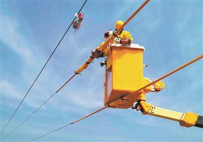 电力工人带电作业。