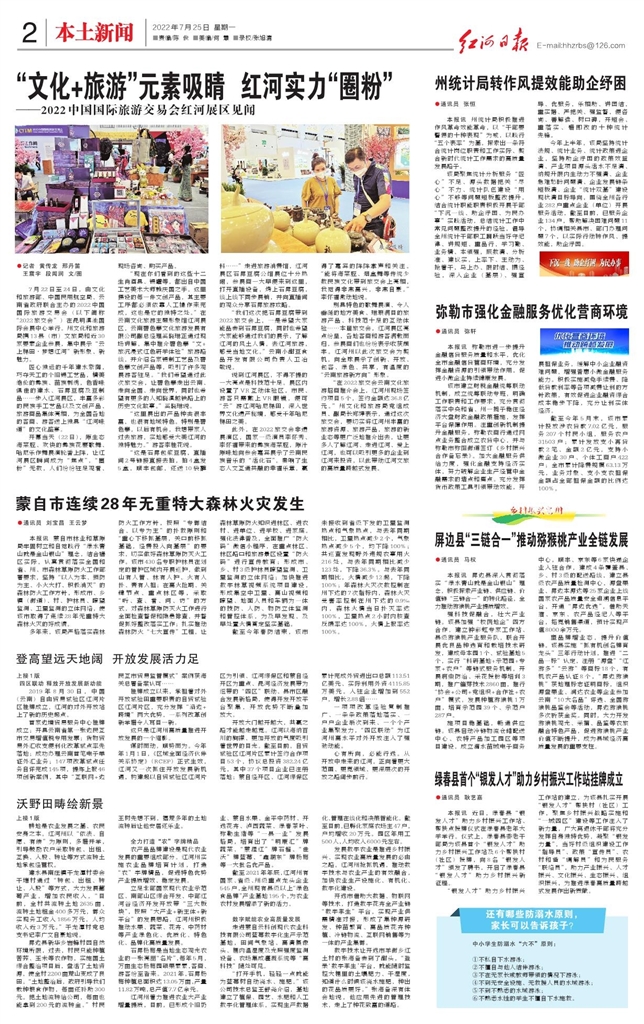7月22日至24日,由文化和旅游部、中国民用航空局、云南省政府联合主办的2022中国国际旅游交易会(以下简称“2022旅交会”)在昆明滇池国际会展中心举行。州文化和旅游局携13县(市)文旅局和近30家要素企业参展,集中展示“云上梯田·梦想红河”新形象、新魅力。
