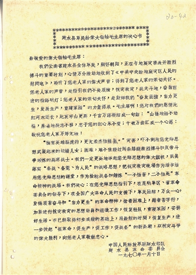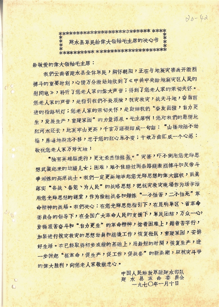 1970年1月5日凌晨1时,峨山、通海、建水、华宁4县发生7.7级强烈地震。此次地震曲江区为极震区,建水县曲江、东山两区90%的房屋倒塌,死亡7479人、受伤9323人。6日,驻昆空军某部向灾区空投食品救急。7日,中共中央给地震灾区发来慰问电,勉励灾区人民“奋发图强、自力更生、发展生产、重建家园”。中国人民解放军驻建水部队和建水县委写了抗震救灾决心书。该档案保存于建水县档案馆。