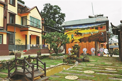 沿着村内干净整洁的道路前行,两旁错落有致的米黄色民居和绚丽多姿的墙体画,充满了浓郁的民族风情。 下转2版 上接1版 入口处的广场上,亭台楼榭、小桥流水,颇显诗意,地上摆放的石碾、墙上挂着的蓑衣和传统农耕用具,无声地诠释着岁月的痕迹和时代的变迁。