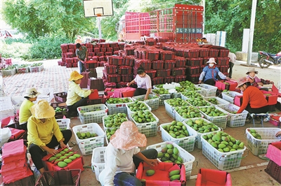翠绿山头泛金黄,群众脸上笑颜开。进入采收季,芒果的清香弥漫在江边乡的每个角落。江边村委会落洪沟村民小组在全乡率先引种芒果,村民正忙着采收成熟的芒果……随着芒果产业的发展壮大,村民笑在脸上、甜在心里。种植芒果前后的收入对比,落洪沟村民小组组长罗正德心里有一笔账:“以前种玉米,一年收入2万元左右,种植芒果后,收入翻了一番,农户每年种植芒果收益达10万元至20万元。”