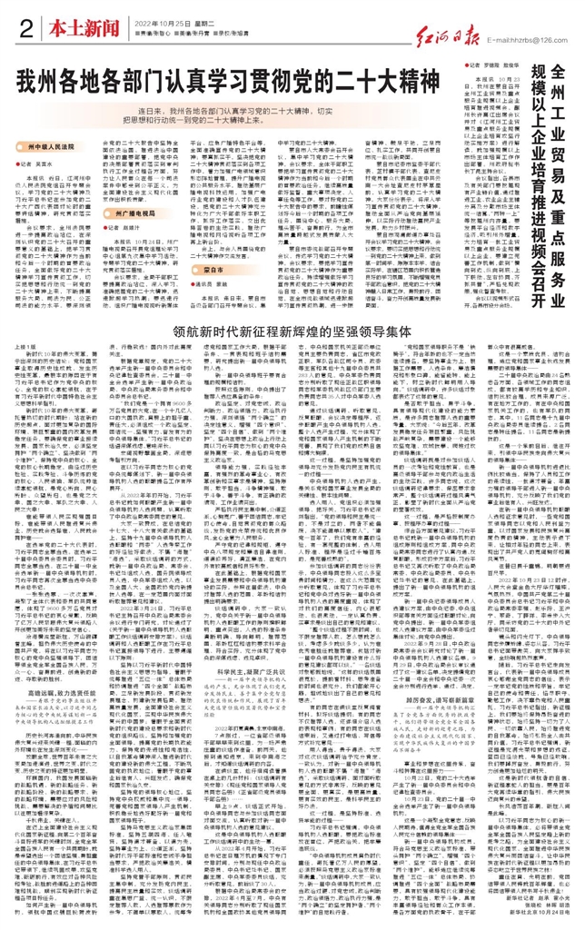 - 我州各地各部门认真学习贯彻党的二十大精神 连日来,我州各地各部门认真学习党的二十大精神,切实把思想和行动统一到党的二十大精神上来。 州中级人民法院 ●记者 吴富水 本报讯 近日,红河州中级人民法院党组召开专题会议,学习党的二十