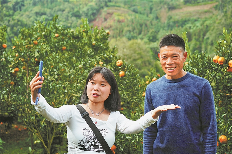 果园里,沉甸甸的果实把树枝压弯了腰,在林间穿行,一不小心就会来个“碰头彩”。村民们挎着背篓、手持剪刀,正忙着采收柑橘,老汪山村河头小组组长钟开陆则在桥头乡宣传干事李绘霞的指导下,学习用手机拍摄短视频,记录下喜人的丰收场景,并通过自媒体向外界推广本村的柑橘。