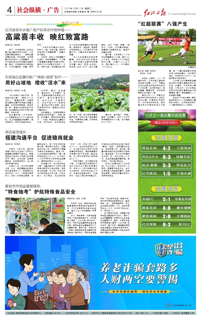 - “红超联赛”八强产生 ●记者 黄健 赵靖汁 吴富水 文/图 本报讯 上周末,2023“中国移动杯”红河州第三届城市足球超级联赛八分之一决赛在红河卫生职业学院足球场进行了4场比赛,经过激烈角逐,起点星耀、