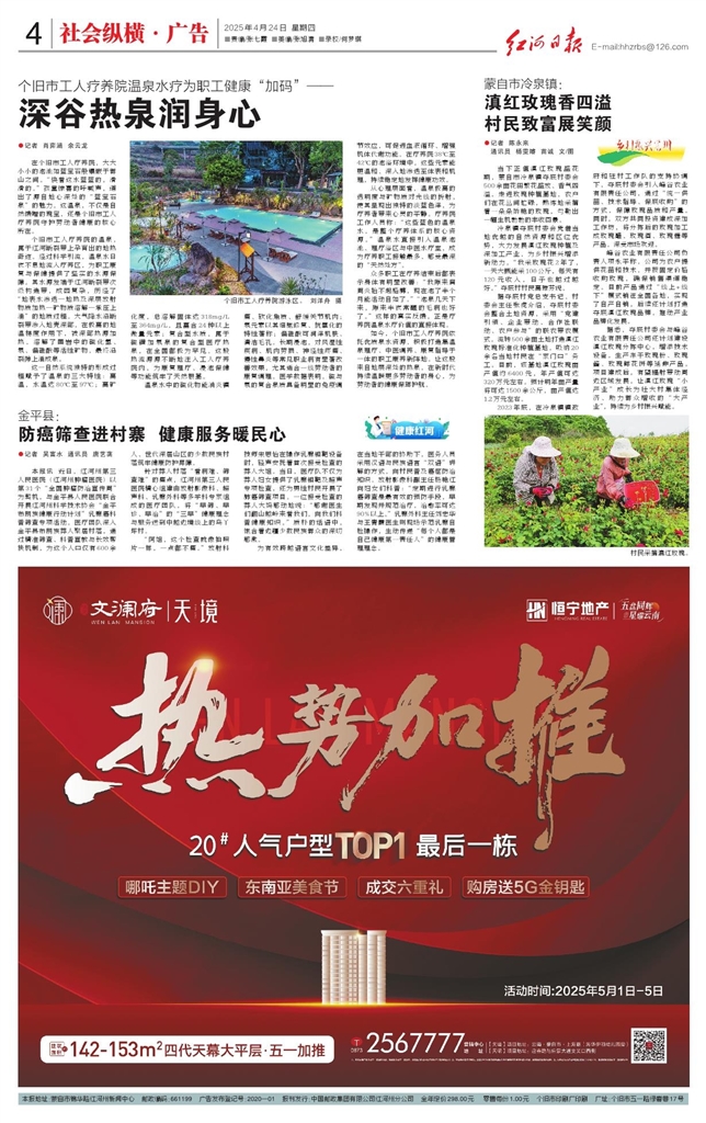 - 滇红玫瑰香四溢 村民致富展笑颜 ●记者 陈永来 通讯员 杨雯璿 苗诚 文/图 当下正值滇红玫瑰盛花期,蒙自市冷泉镇夺底村委会500余亩花田繁花盛放、香气四溢。走进玫瑰种植基地,农户们在花丛间忙碌,熟练地采摘着一朵