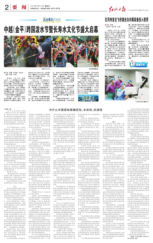 - 中越(金平)跨国泼水节暨长寿水文化节盛大启幕 ●记者 黄健 李梓毓 王金河 资颖 陈倩 文/图 本报讯 4月26日,中越(金平)2025年跨国泼水节暨长寿水文化节在金平县国门文化广场欢乐启幕,来自各地的游客与当地群众共赴水