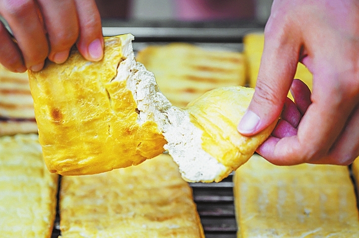 石屏豆腐美味的秘诀,在于神秘的地下井水,石屏特有的地下“酸水”按照比例与豆浆融合,凝固成型后,便可切成均匀的条块。手艺人巧手点制,食客们也自有门道,在石屏吃豆腐,边吃边烤,才是最地道的享受。掰开表皮金黄的豆腐,一口下肚,外酥里嫩,豆香四溢。