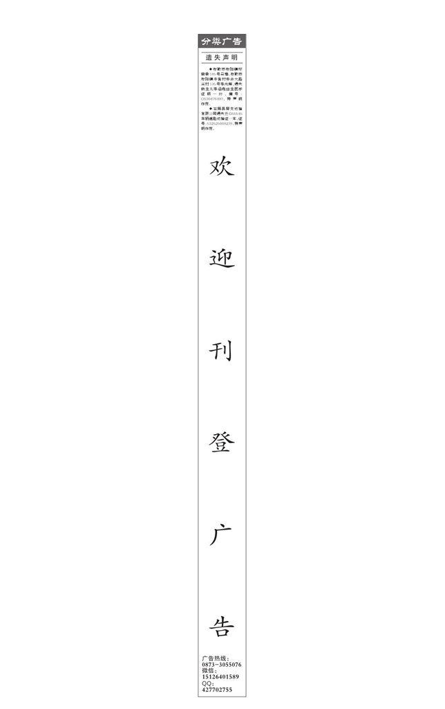 • 分类广告   遗失声明   ◆弥勒市弥阳镇环南巷185号马瑞、弥勒市弥阳镇牛背村委会大路溪村135号李光辉,遗失新生儿李涵垚出生医学证明一份,编号:Q530476497,特声明作废。   ◆石屏县异龙运输有限公