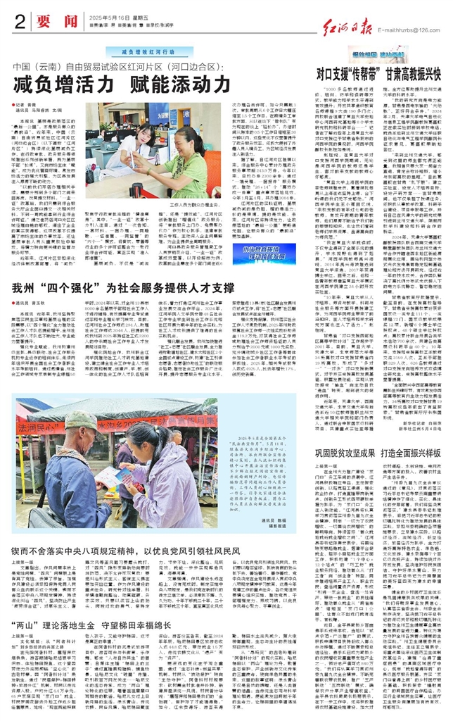 强化院地合作。我州联合红河学院推动社工人才研究基地建设,建立健全社会工作专业人才培养政策和制度,创建产、学、教、创一体化的社会工作人才队伍培育体系,着力打造红河州社会工作事业发展交流合作平台。2024年,红河学院人文学院安排48名社会工作专业学生到社会工作系统和社区开展为期半年的社会实践,为社工人才成长提供了难得的社会实践机会。