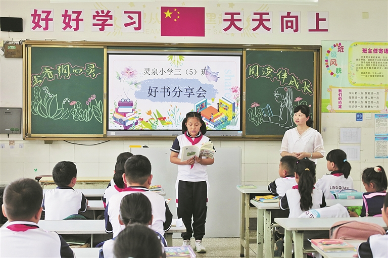走进灵泉小学的队会课堂,朗朗读书声此起彼伏。以“世界读书日”为契机,同学们在老师的带领下,通过集体朗读、制作好书推荐卡、摘抄佳句小卡片等形式,分享阅读心得,感受书香魅力。这只是灵泉小学特色“泉”文化的一个缩影。学校精心打造读书节、劳动节、艺术节、科技节、体育节“灵泉五节”活动体系,将文体活动深度融入课堂教学,为学生搭建起多元发展的广阔舞台,校园文化生活丰富多彩。