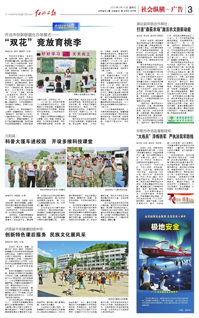 - 科普大篷车进校园 开设多维科技课堂 ●通讯员 林嘉睿 文/图 本报讯 近日,元阳县“矢志创新发展・建设科技强国”全国科技日科普大篷车进校园活动走进南沙中学。一辆满载前沿科技设备的“科学移动方舟”,为百余名师生带来一场沉浸式