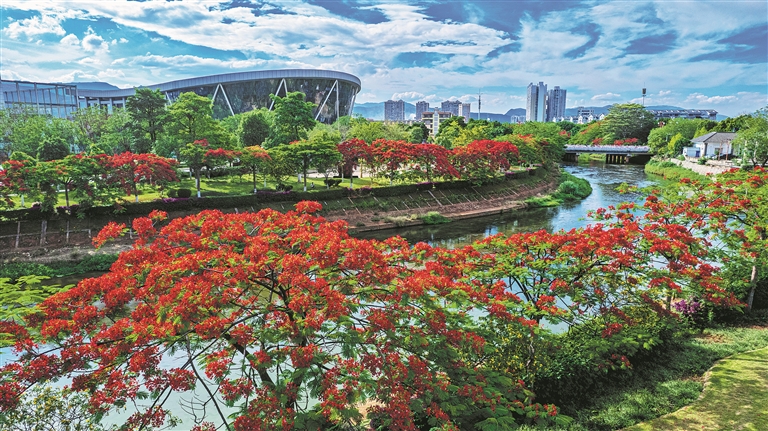 近日,在开远市的公园、小区、河岸,凤凰花竞相绽放,火红的花朵与碧水蓝天交相辉映,吸引了众多市民、游客前来打卡拍照。图为泸江河岸边盛开的凤凰花。