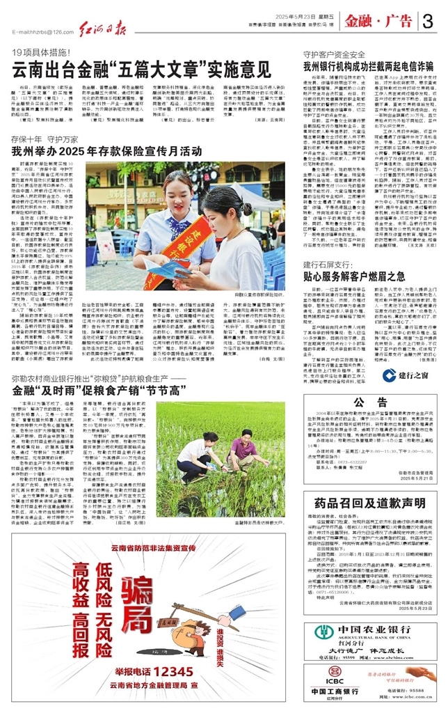 - 我州举办2025年存款保险宣传月活动 时值存款保险制度实施10周年,近日,“存保十年 守护万家”2025年云南省红河州存款保险宣传月启动仪式暨宣传成效国门巡展活动在河口县举办。活动由中国人民银行红河州分行、河口县人民政府联合主办,中