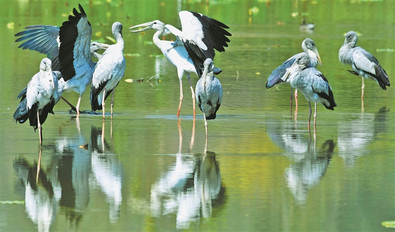 钳嘴鹳属国家“三有”保护动物,为越冬候鸟。近年来,随着异龙湖保护治理和生态修复的深入推进,当地湿地生态系统逐步恢复,为鸟类提供了稳定的栖息环境,钳嘴鹳已逐渐成为留鸟。