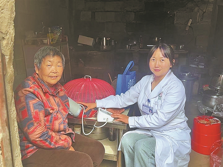 村里老人多,李玲漫的出诊包成了最温暖的“移动诊所”。患有糖尿病的刘梅仙子女常年在外,每次李玲漫上门,她都格外开心。李玲漫不仅细心为老人检查身体、调整用药,还关注其饮食,让刘梅仙直夸贴心。五月的正午,烈日当头,李玲漫常常背着沉甸甸的诊疗箱穿梭在田间小路上,被汗水浸透的刘海黏在额头上,白色工作服多次被汗水打湿,而这些对李玲漫而言早已习以为常。