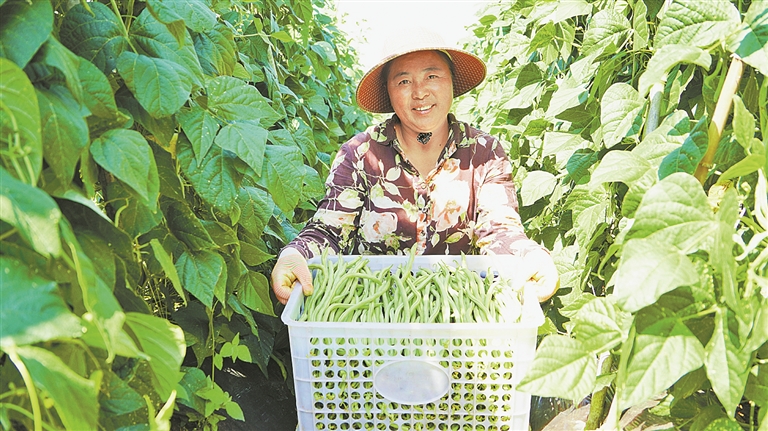种植户聂健菠穿梭于豆角架间,熟练地采摘成熟的无筋四季豆,不一会儿,箩筐里就装满了鲜嫩的豆角。由于种植面积大,为尽快采摘完豆角,聂健菠还从村里请了人帮忙一起采摘。“豆角长得快,3天就要采摘一次,一般两亩地请3到5个人,要摘两天。”聂健菠说,价格好的时候亩产值约1万元。