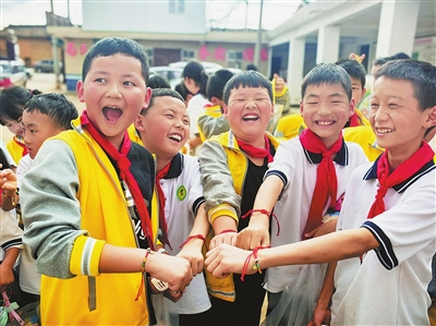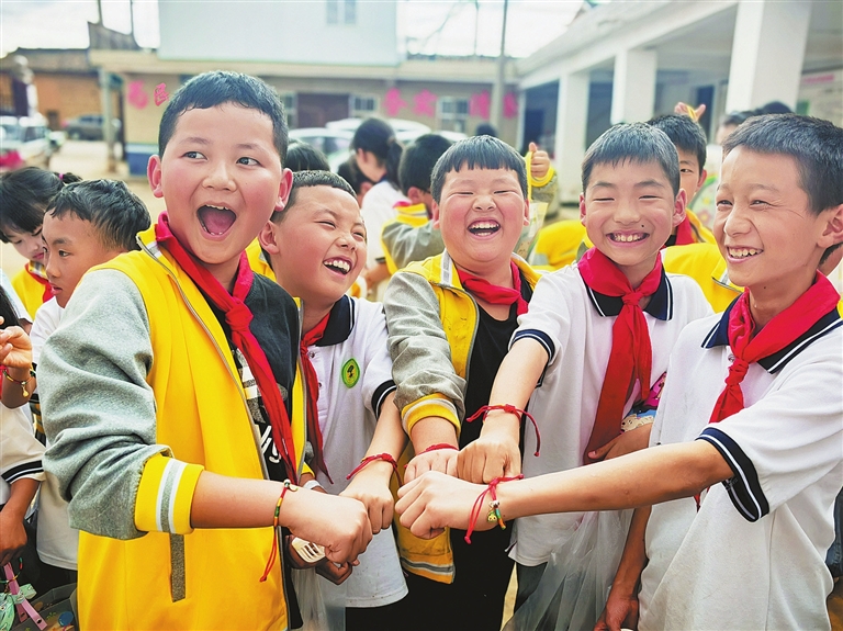 近日,泸西县白水镇巨木村依托新时代文明实践站举办文明实践活动,汉族、回族、彝族、壮族等多个民族的学生、群众、志愿者共同参与。近年来,白水镇紧紧围绕铸牢中华民族共同体意识这条主线,依托中华传统节日,精心组织开展系列活动,促进各民族交往交流交融。图为各民族学生在展示系在手上代表祝福的红绳。