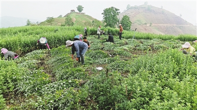 种植艾草技术简单,回报快。该乡通过组织周边村民参与种植、管护、采收等环节,吸纳本地劳动力80人,实现人均月增收1500元,为村民提供“家门口”就业机会。此外,当地村民通过在基地务工获得劳务报酬,将土地流转给公司收取租金,参与订单种植收获酬金,实现了“一地生三金”。