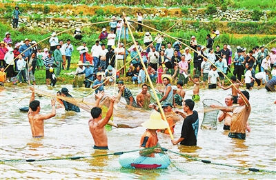 近日,弥勒市巡检司镇高甸村委会麦塘村民小组迎来一年一度的捕鱼活动。村民手持扳罾、鱼罩、鱼筢等传统工具,开展别具一格的捕鱼活动。近年来,麦塘村通过保护水源、发展生态渔业、举办传统捕鱼活动等推动乡村旅游,走出了一条独具特色的乡村振兴之路。图为村民们正在捕鱼。