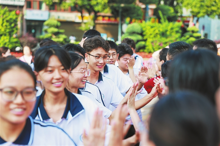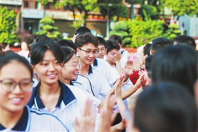 图一为在开远市第一中学考点门口,赴考学子与送考老师相互击掌加油。 通讯员 陶家淇 摄影报道